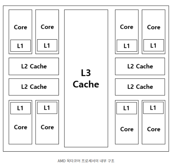 캐시 메모리의 작동 순서가 L1에서 순차적으로 데이터를 찾아 L1에 찾고자 하는 데이터가 없다면 순서대로 L2, L3로 올라가며 데이터를 찾는것이다.