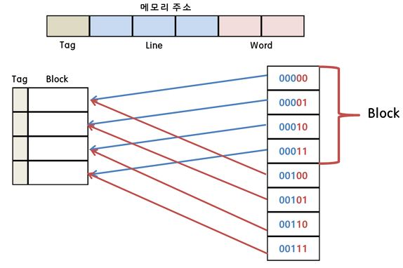 같은 라인에 위치하는 데이터는 파란색 색칠한 영역에 의하여 구별이 가능하다. 예를 들면 메모리의 첫번째 주소 00000과 다섯번째 주소 00100은 캐시내에 같은 위치에 자리 잡고 있어서 구별이 필요한데, 앞의 세자리 000과 001로 구별을 할 수 있다.