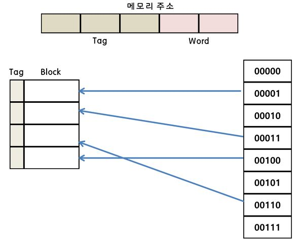 캐시메모리의 크기는 메인 메모리보다 훨씬 작기 때문에 매핑하기 위해선 주소값 전체를 사용하지 않고 특정 값만 인덱스로 사용하고 다른 값은 태그(Tag)로 사용하게 된다.