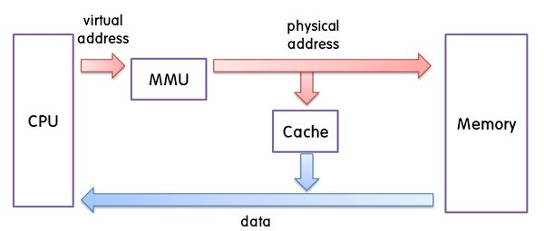 따라서 중간에 메모리 관리 장치(MMU)가 가운데에서 번역을 하여 메모리가 알 수 있는 물리주소로 변환해준다. 그리고 캐시에 해당 주소에 대한 데이터가 있는지 확인을 하는데 캐시에 데이터를 저장하는 방식에 따라 물리주소를 다르게 해석할 수 있다.