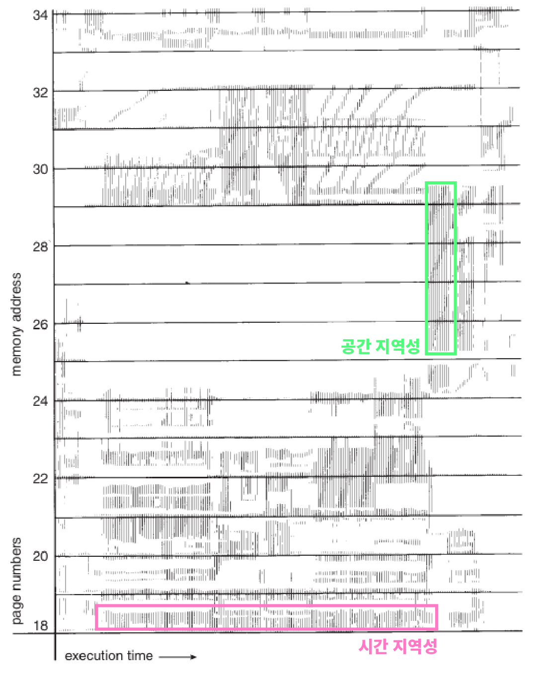 가로 축은 실행시간이고, 세로축은 메모리 주소다. 즉, 수평으로 이어진 참조 기록은 긴 시간에 걸쳐 같은 메모리 주소를 참조하여 시간적 지역성을 나타내고, 수직으로 이어진 참조 기록은 같은 시간에 밀접한 메모리 주소들을 참조한 공간 지역성을 나타냅니다.